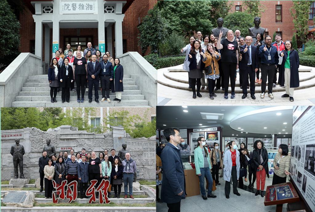 当日下午,老师们前往湘雅医院和湘雅医学院。湘雅医院国际合作与交流办公室主任李学军和副主任龙畅为大家详细讲解了湘雅医院的历史起源,并带领大家实地参观了医院红楼、铜像广场和历史文化长廊。随后,一行人来到湘雅医学院,在石展艺老师的带领下参观了人体形态学科技馆和湘雅医学院院史馆,对湘雅医学的历史、发展和现状有了较为系统的了解。