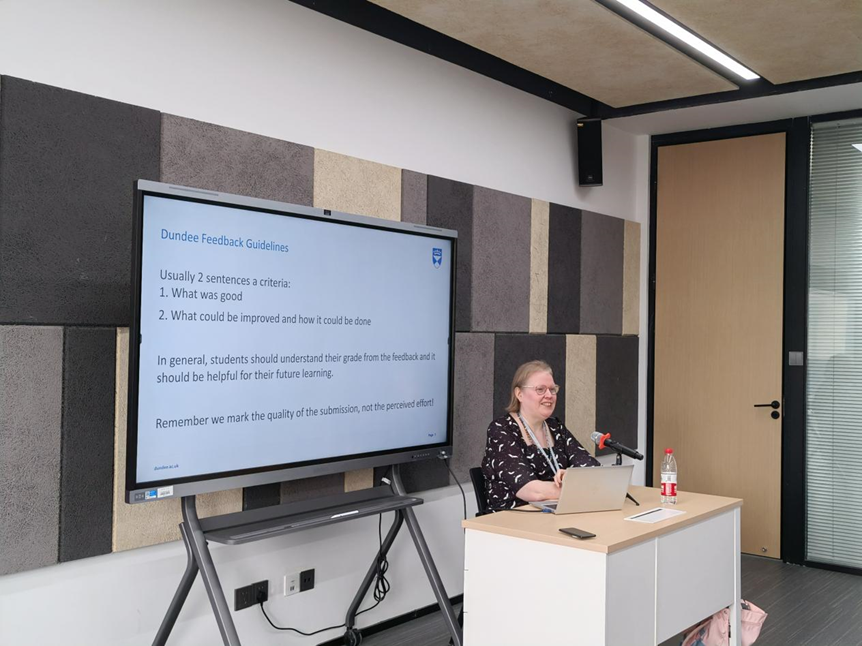 2022-2023学年第二学期全体授课教师在六楼研讨室进行了一场关于Assignment and Marking的教学沙龙。外方副院长Karen Petrie作为主讲人,为大家详细讲解了如何使用MyDundee平台、如何评分并给学生反馈等。