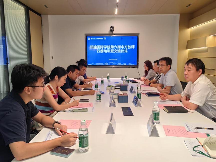 在一楼会议室举办第六期中方教师行前培训交流活动。学院党总支书记高东波、院长高广军出席并致辞,邓迪大学项目经理欧阳樱子和教师代表徐宇锋进行了经验分享,5名第六期赴英培训教师参加。