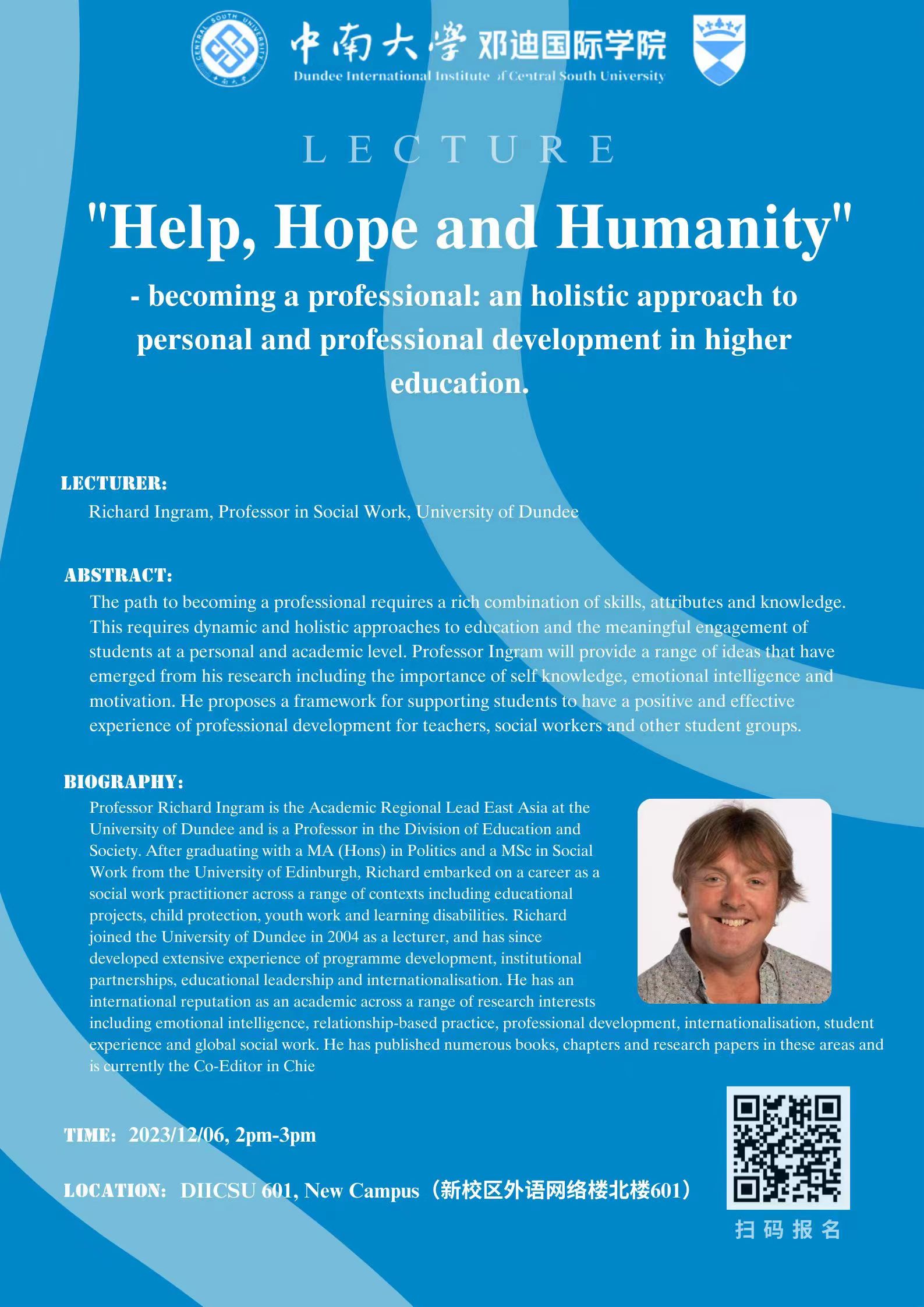Bio: Professor Richard Ingram is the Academic Regional Lead East Asia at the University of Dundee and is a Professor in the Division of Education and Society. After graduating with a MA (Hons) in Politics and a MSc in Social Work from the University of Edinburgh, Richard embarked on a career as a social work practitioner across a range of contexts including educational projects, child protection, youth work and learning disabilities. Richard joined the University of Dundee in 2004 as a lecturer, and has since developed extensive experience of programme development, institutional partnerships, educational leadership and internationalisation. He has an international reputation as an academic across a range of research interests including emotional intelligence, relationship-based practice, professional development, internationalisation, student experience and global social work. He has published numerous books, chapters and research papers in these areas and is currently the Co-Editor in Chief of the Social Work Education journal and the UK lead in the European Association of Schools of Social Work. Richard will speak about his research and practice in the area of developing professionals in education settings and the insights from research exploring how best to understand the socio-emotional experiences of students as they learn and develop.