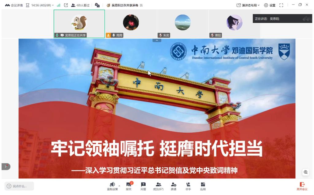 本次学习活动以“牢记领袖嘱托,挺膺时代担当”为主题,从大会介绍、习近平总书记贺信、党中央致词以及总结指导四个部分展开。吴思阳首先对全国青联十四届全委会和全国学联二十八大进行了介绍,强调了本次学习活动的重要意义,并通过h小说