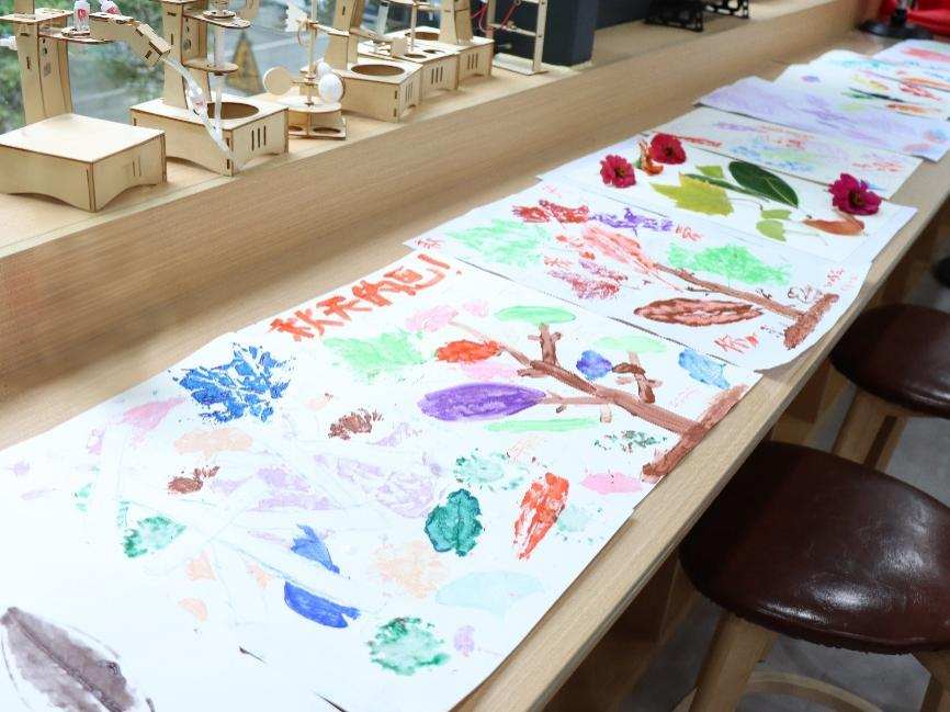 在作品分享环节,一位阿姨的作品尤为动人。她以隶书写就“秋天”二字,旁题苏轼名句“一年好景君须记,正是橙黄橘绿时”,并绘有一只即将冬眠的青蛙。她分享道:“秋天不是结束,而是沉淀与丰饶。”小朋友安安则用红橙双色拓印出海棠叶,童言稚语中满是对季节炽热的感知。这些发自内心的表达,赋予非遗技艺更深层的文化内涵与生命感悟。