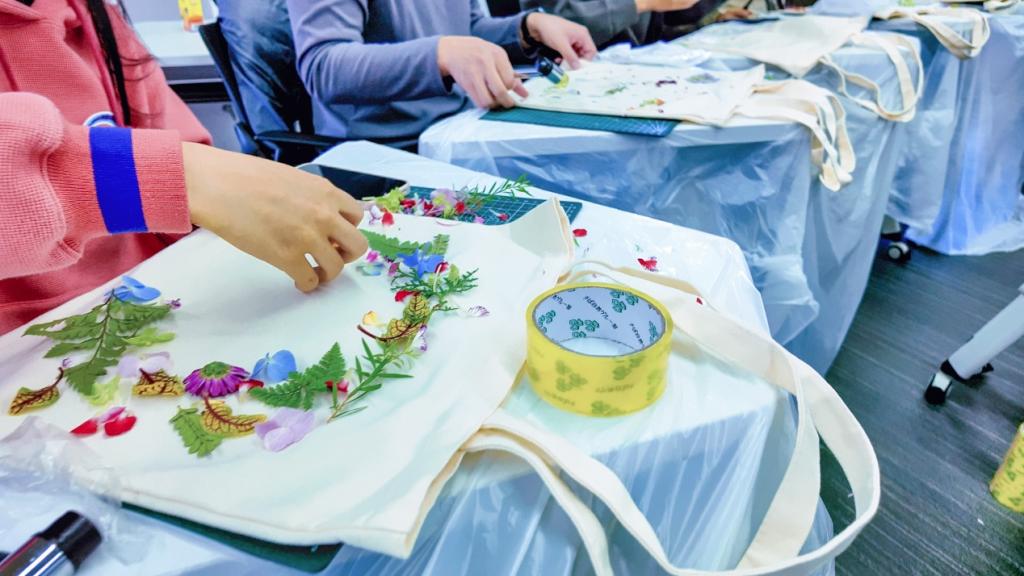 活动围绕春、夏、秋、冬四个季节为主题展开,分别对应不同的非遗技术或手工技法:春季的树叶浆汁拓印帆布袋,夏季的颜料树叶拓印手工画,秋季的树叶剪纸挂件与叶雕书签,冬季的树叶制作手账书册。这些环节为同学们打造了一个沉浸式体验传统文化与自然美学相交融的创意平台。